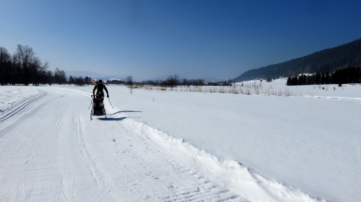 Cela nous paraissait correct, par rapport aux distances habituellement réalisées en mode sport en skating ... mais c'était sans compter la chariotte à tirer, notre forme du moment, la météo et la qualité de la glisse (et du damage) que nous avons rencontrés.