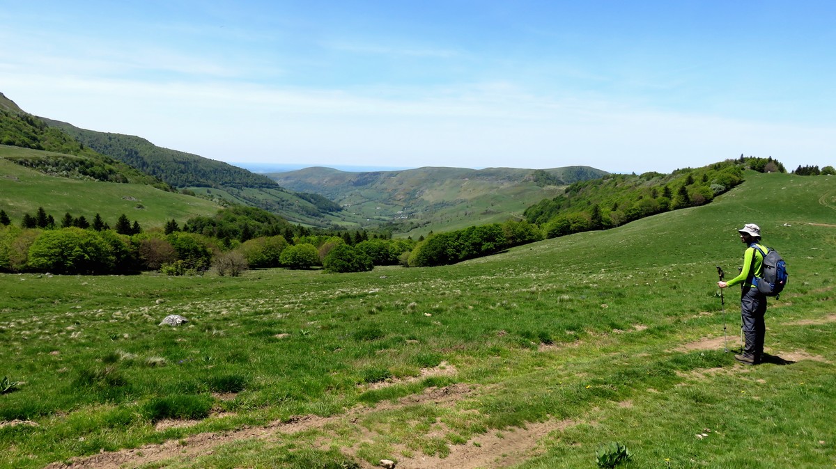 Comme d'habitude, nous n'avons rien préparé la veille du départ ! Branle-bas de combat ce matin ... nous partons qu'à 9h15. Après quelques embouteillages en ce début de week-end de l'ascension, nous arrivons à Super Lioran. Nous nous garons au pied du téléphérique et commençons la montée vers le Plomb du Cantal. Ça grimpe dur dès le début. Nous sommes souvent sur les pistes de la station. Le paysage au loin est beau mais les remontées mécaniques sont trop présentes. Les randonneurs qui descendent sont habillés chaudement, parfois en doudoune, alors que nous, nous crevons de chaud ... bizarre ! En haut, effectivement, il y a beaucoup de vent. Cela nous rappelle notre tour de l'année dernière, au Puy de Sancy, où le vent nous avait fait abandonner les crêtes ... après une nuit dantesque et un arceau de tente en moins ! Aujourd’hui, rien de tel, nous continuons. La vue est superbe au sommet à la table d'orientation. Nous enchainons ensuite par les crêtes et Puy Brunet, col de la Pourtoune, col de chèvre (avec un troupeau de chèvres !) et Puy Gros. C’est très roulant, tout en faux plat descendant. A la Tuillière Buron, le GR tourne à droite pour descendre plus raide vers notre gîte, le gîte de Lafon au dessus de Thiézac. Nous nous posons au soleil avec un groupe de quatre randonneurs savoyards en attendant le dîner, livré par une ferme auberge. Au menu, un avant goût de la cuisine locale légère, saucisses et truffade …