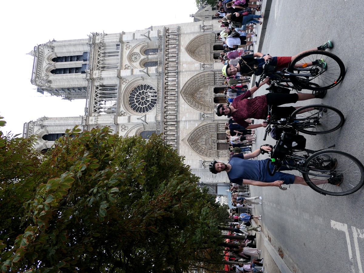 C'est parti pour une étape reliant deux lieux mythiques ! Au départ de notre « Appart City Hôtel Bibliothèque François Mitterrand », nous suivons la Seine jusqu'à Notre Dame. C'est très pratique avec une ancienne voie de voitures dédiée maintenant aux vélos ! Aux environs de Notre Dame, nous mettons pied à terre à cause de la foule. Du parvis, nous suivons la trace de la véloscénie en passant par Saint-Michel. Entre voies cyclables et grands boulevards, ce n'est pas si désagréable et même très sympa, mais il faut rester vigilants. En ce mois d'août, c'est assez calme. A partir de Montparnasse, puis Malakof, ce n'est que du bonheur jusqu’à Massy le long de la voie verte de la Bièvre, super bien aménagée. Très variée, un peu sinueuse et légèrement vallonnée, elle est très agréable à suivre. Nous pique-niquons à Sceau avec vu sur le château. A Jouy en Josas, nous nous arrêtons juste 5 min au musée de la toile pour montrer à Antoine et Stéphane ce que c'est, et remontons vers Versailles sur les bords de la départementale... c'est la montée du jour ! Nous terminons par la majestueuse avenue de Paris, plus large avenue d'Europe, 90 m de large pour 2,5 km de long, et arrivons droit sur le château de Versailles, comme Louis XIV à l'époque, mais en pédalant !