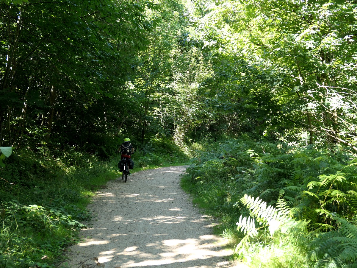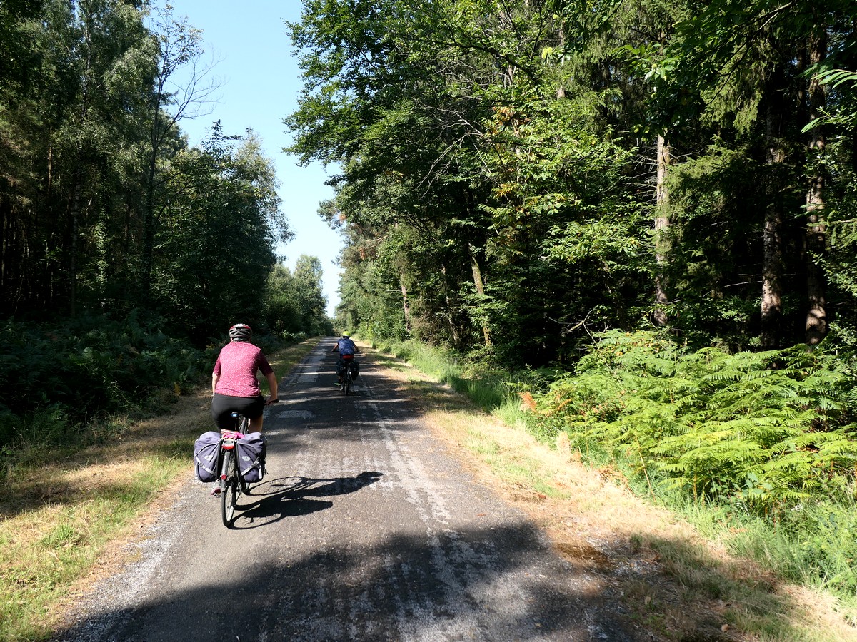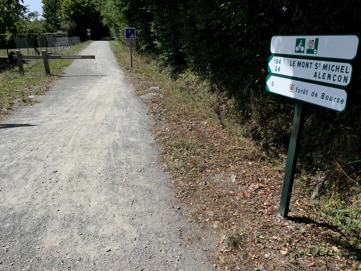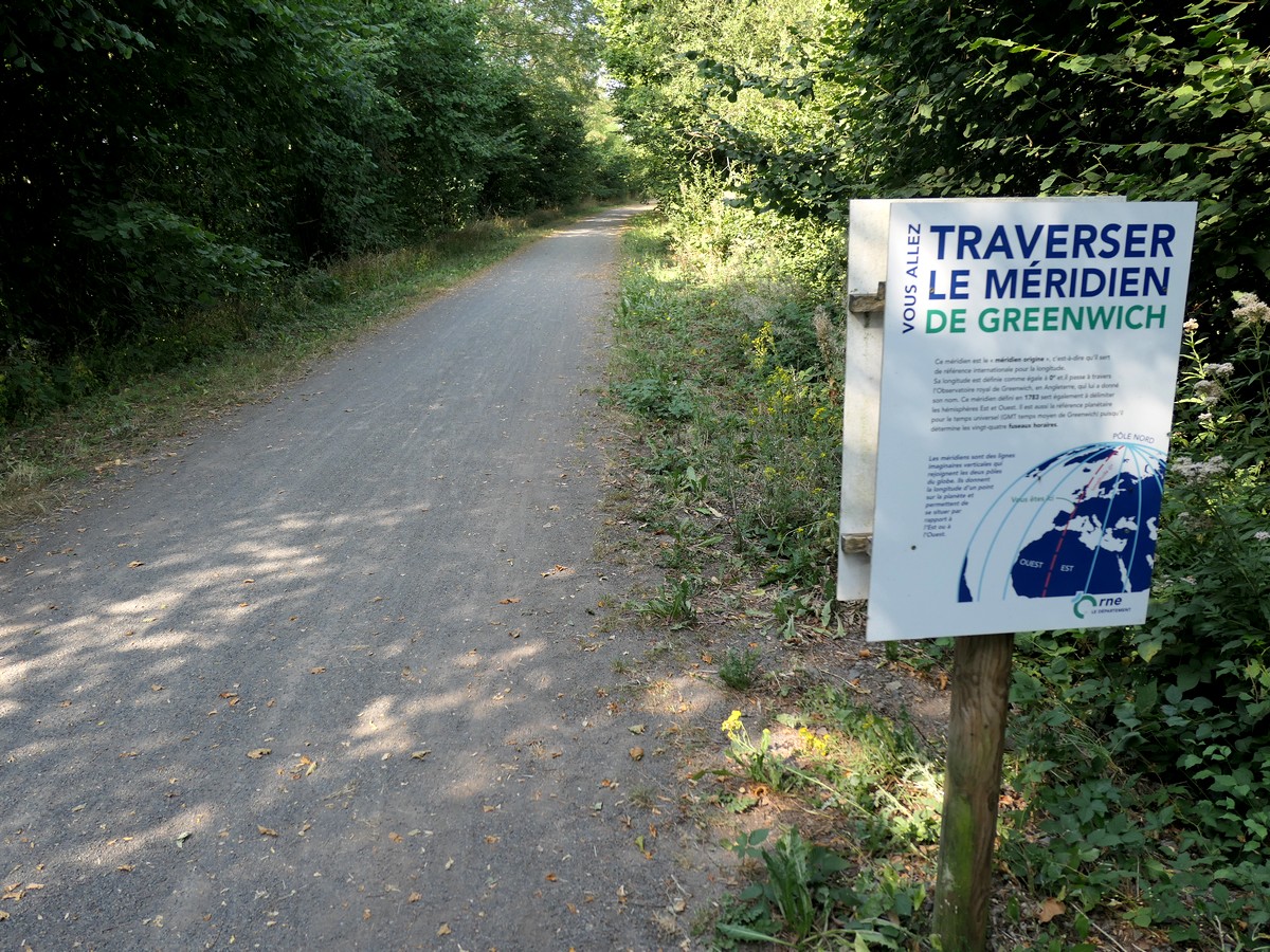 Journée "Voie verte ancienne ligne chemin de fer" donc… pas grand chose à dire… à part le passage du méridien de Greenwich et beaucoup d'anciennes gares le long du chemin. Nous avions le choix avec un itinéraire plus sportif par Carrouge et son château mais avons préféré celui-ci. Cependant, toute la première partie de l'étape est finalement en faux plat montant, sur un revêtement souple, dû à pas mal de gravillons. Nous avions l'impression de nous enfoncer parfois et donc de ne pas avancer. La monotonie de la voie n'a rien arrangé. Bref, pas si facile que ça... A partir de Couterne, nous quittons la voie verte pour "grimper" vers Bagnole de l'Orne pour les 8 derniers kilomètres. J'en profite pour passer par SEQENS. Nous empruntons parfois des chemins forestiers pour arriver à Bagnole. L'accueil à l'hôtel Bellevue est professionel et très très attentionné.