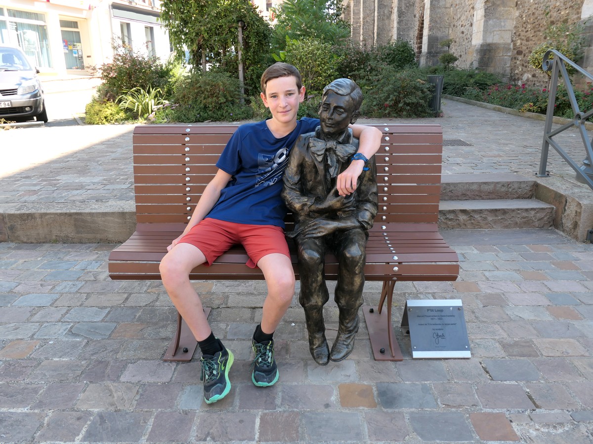 Nous débutons cette journée pas trop tard. Nous avons une soixantaine de kilomètre à faire aujourd'hui. De plus, une canicule est annoncée... enfin bon, rien à voir avec chez nous ; en plus le fond de l'air est presque frais, quand on roule, c'est nickel. La sortie de Chartres est aussi agréable que l'entrée sur une voie verte. Ensuite, c'est la Beauce... des champs à perte de vue, tout plat et tout droit, sous le soleil, sans arbre. A midi, nous nous arrêtons à Illiers Combray, le village natal de Marcel Proust, pour le pique-nique. L'après-midi, nous entrons dans le parc naturel du Perche, sur des routes un peu plus ombragées, larges et presque sans voiture. Après un mini col culminant à 240 m (!), nous redescendons sur Thiron Gardais, notre village étape. Balade autour de l'abbaye, uno dans le jardin de l'hôtel et dîner dans une guinguette au-dessus de l'étang.