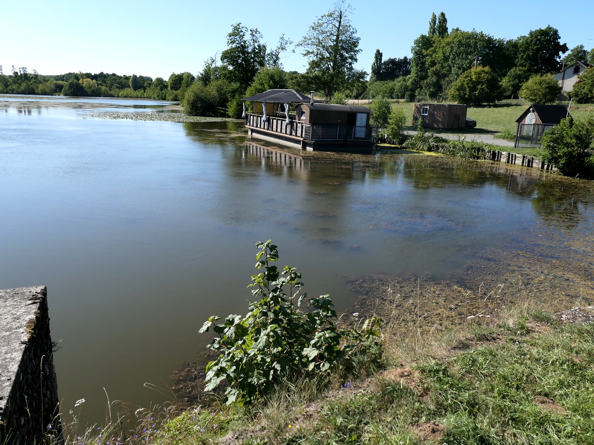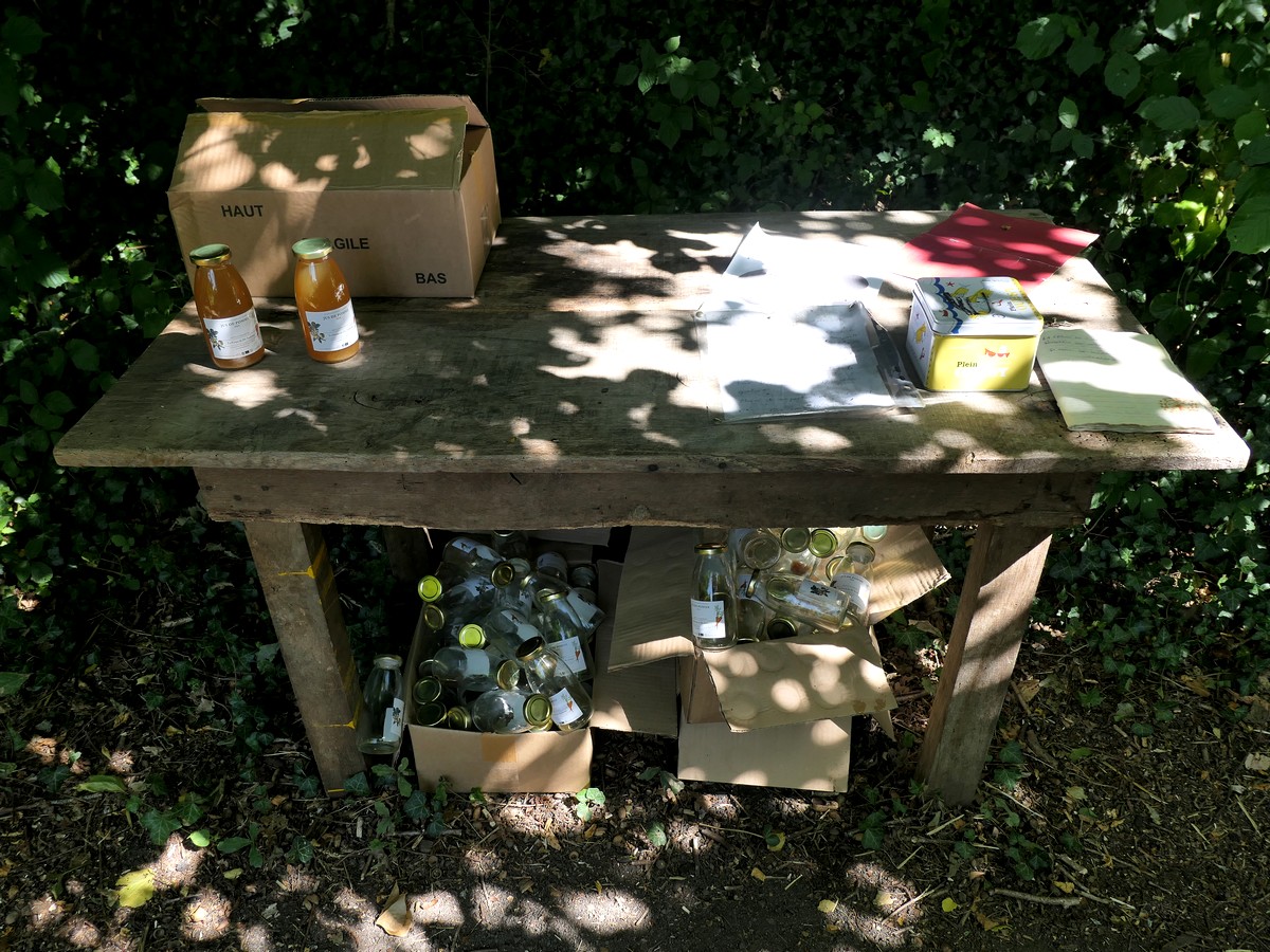Départ tardif aujourd'hui. On s'est bien caillés dans le « bungalow tente » du camping. RAS côté véloroute. Il s'agit d'une voie verte jusqu'au bout. Ah si, une petite halte bien sympa en bord de route. Un fermier a déposé des jus de pomme de son exploitation à payer en ligne si l'on se sert dans les cartons. A midi, nous avons fait la montée hors voie verte pour pique-niquer à ???? sur la place. L'après-midi, c'est toujours tout droit et à l'ombre. Nous rencontrons de nouveau une mère (Claire) et sa fille que nous avons vues hier. Elles ont débuté à Thiron Gardais où elles habitent et vont jusqu'à Bagnole. A l'arrivée à le Mêle sur Sarthe, direction le lac !