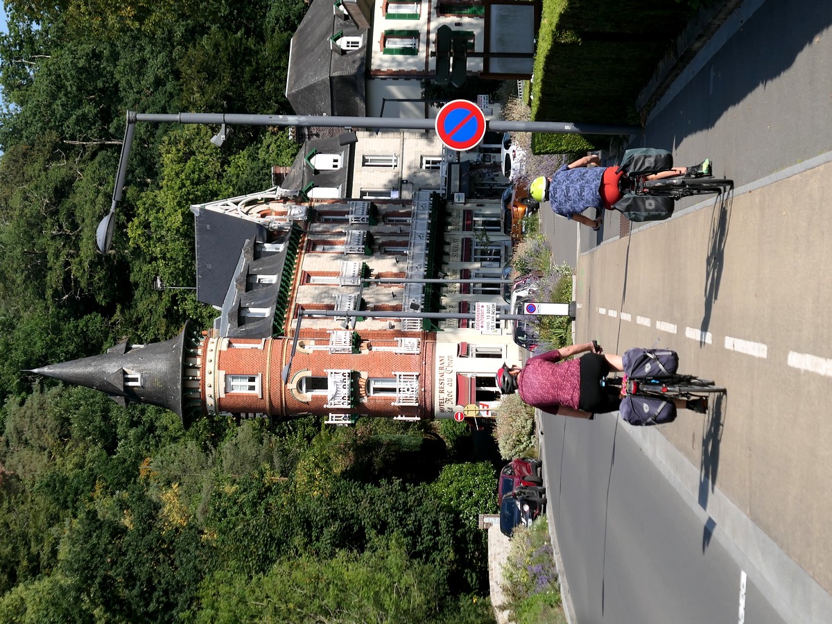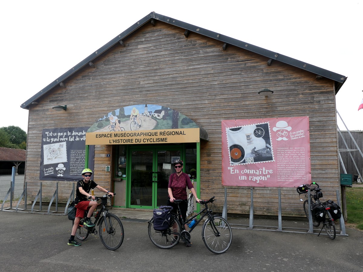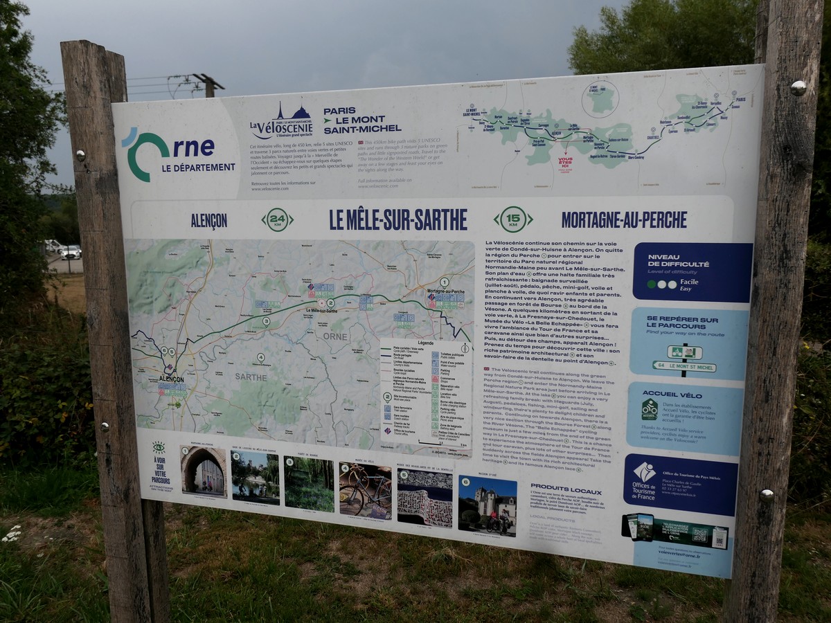 Petite étape aujourd'hui, mais nous avons trouvé un moyen de la rallonger un peu. Nous partons après un super petit déjeuner... sous une petite averse. Et oui, aujourd'hui, alors que la France est en canicule, nous sommes ici au frais, sous les nuages. Nous regagnons rapidement la voie verte de l'ancien chemin de fer. Nous la quitterons au bout de quelques kilomètres pour rejoindre le musée du ... vélo ! Assez intéressant mais beaucoup axé sur les champions et le Tour de France. Nous pique-niquons en vrac adossés par terre au « Cocci market » du village. Nous rejoignons la véloroute par de petites routes et arrivons rapidement à Alençon. Nous prenons nos quartiers dans notre petit hôtel... proche du complexe aquatique, mais où nous n'irons pas. Visite du centre ville, de la cathédrale avec la découverte du couple de saints ??? Et ????, puis resto et dodo !
