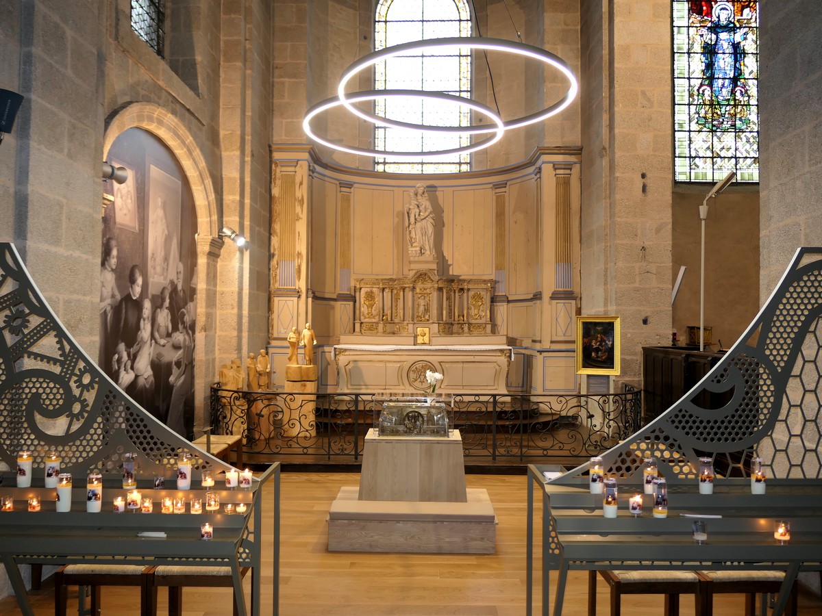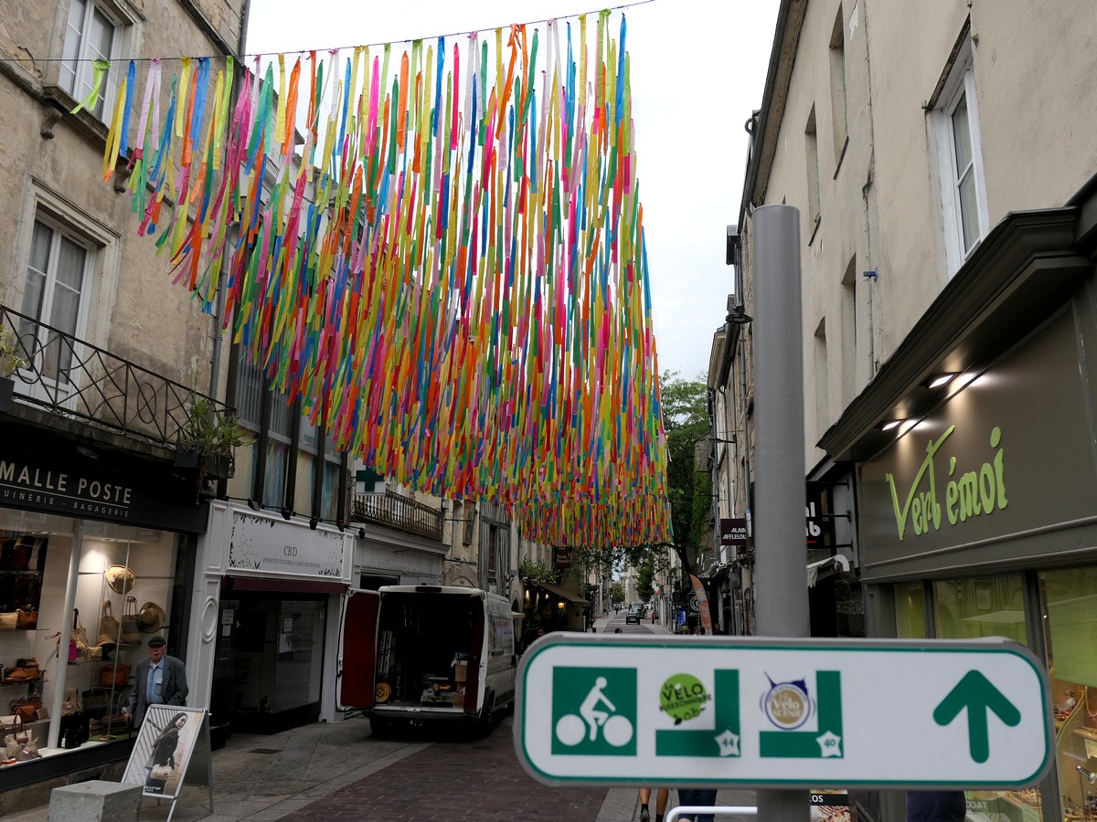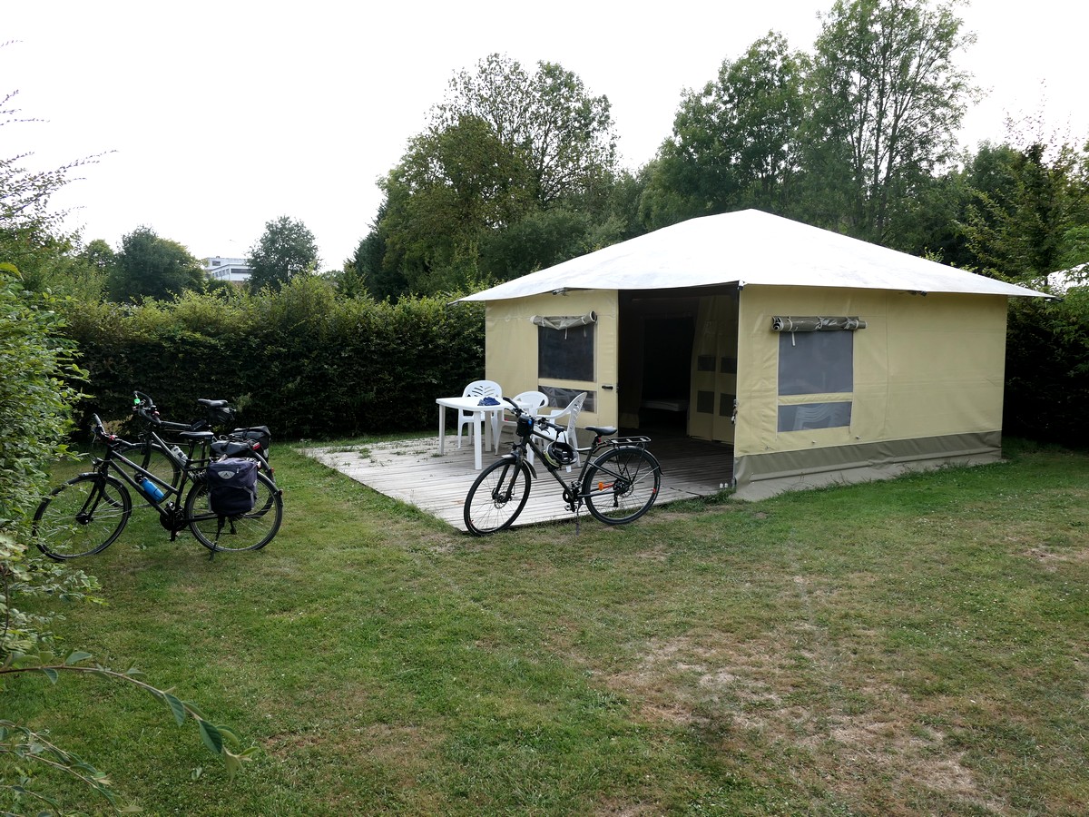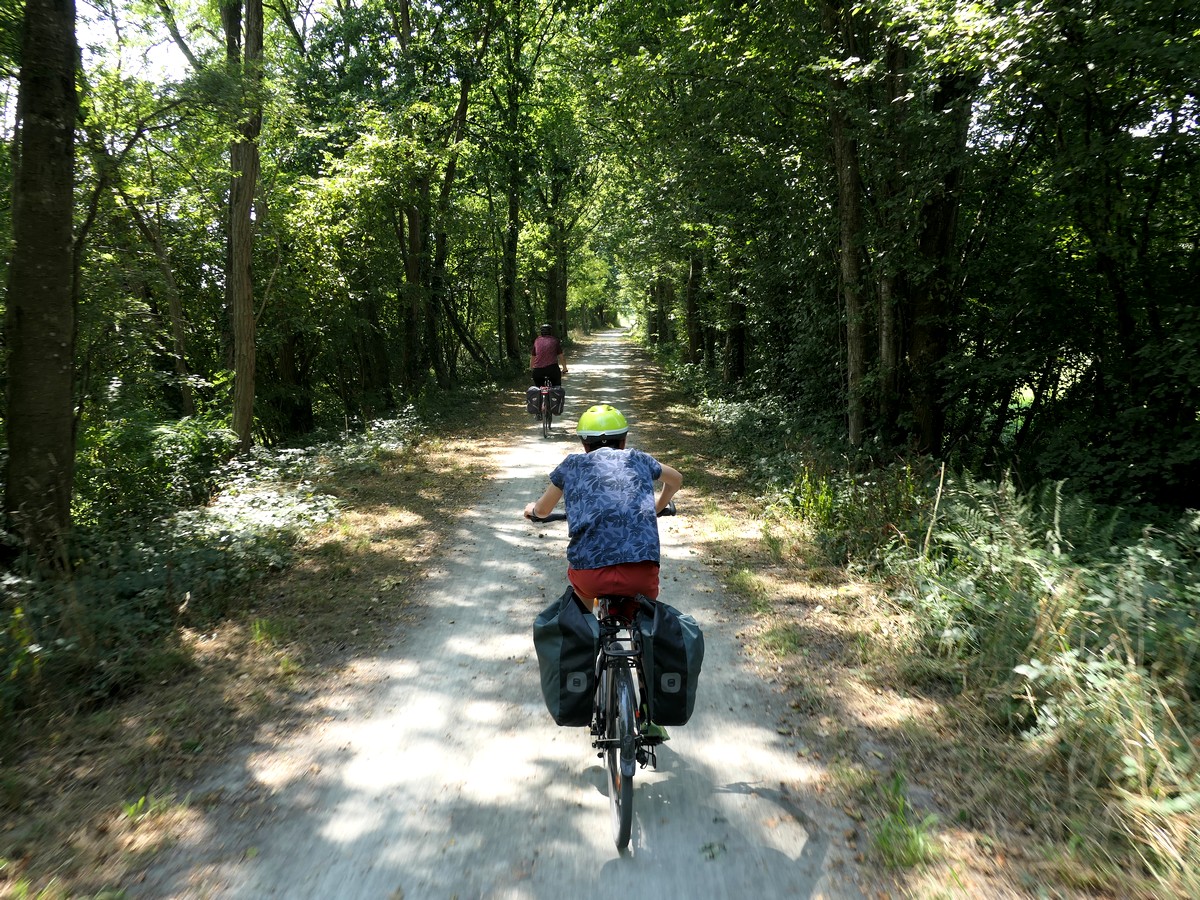 Petite étape aujourd'hui, mais nous avons trouvé un moyen de la rallonger un peu. Nous partons après un super petit déjeuner... sous une petite averse. Et oui, aujourd'hui, alors que la France est en canicule, nous sommes ici au frais, sous les nuages. Nous regagnons rapidement la voie verte de l'ancien chemin de fer. Nous la quitterons au bout de quelques kilomètres pour rejoindre le musée du ... vélo ! Assez intéressant mais beaucoup axé sur les champions et le Tour de France. Nous pique-niquons en vrac adossés par terre au « Cocci market » du village. Nous rejoignons la véloroute par de petites routes et arrivons rapidement à Alençon. Nous prenons nos quartiers dans notre petit hôtel... proche du complexe aquatique, mais où nous n'irons pas. Visite du centre ville, de la cathédrale avec la découverte du couple de saints ??? Et ????, puis resto et dodo !