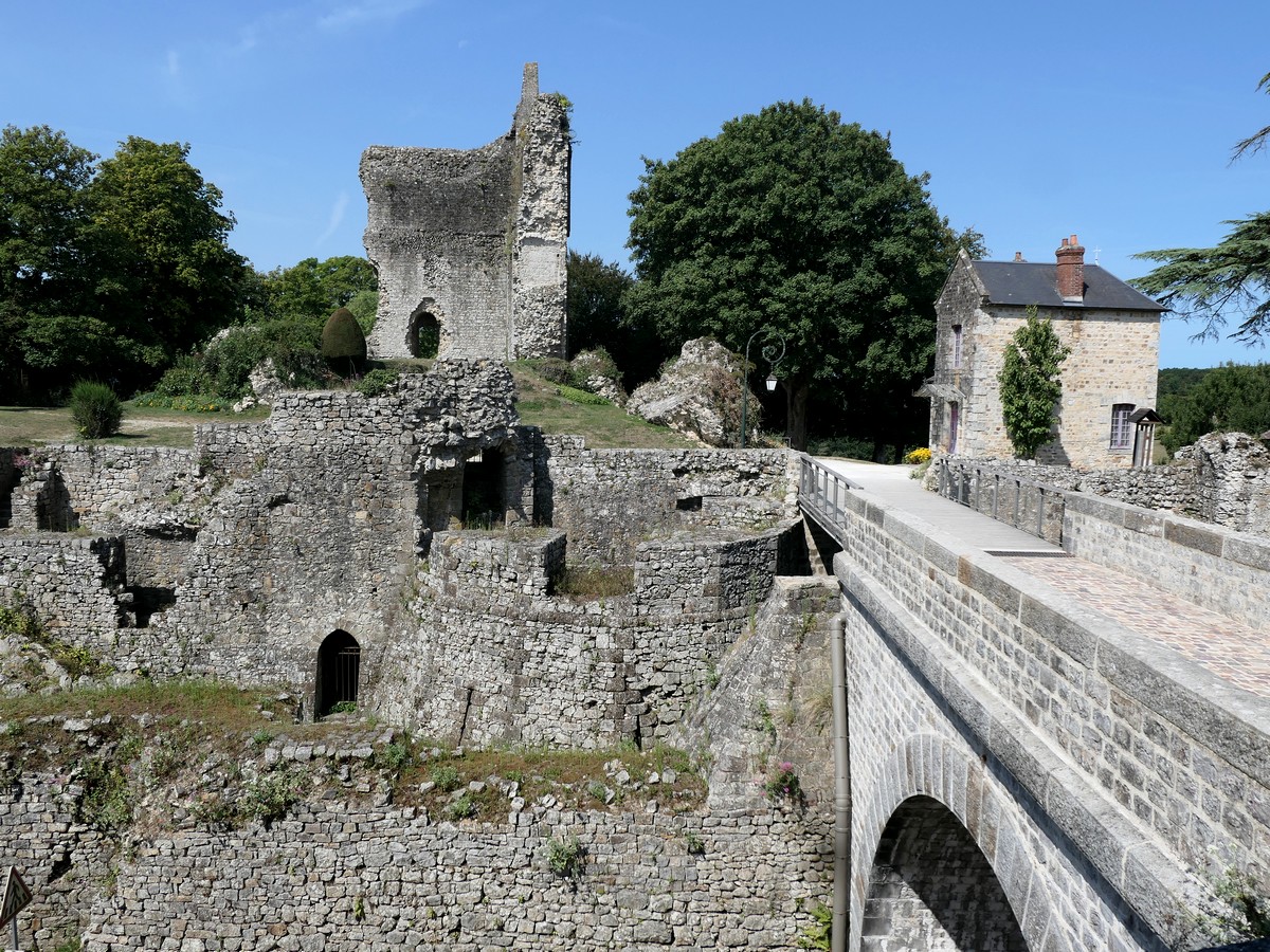 D'abord, de la sortie de Bagnole de l'Orne à Donfromt, la véloroute consiste en de grandes lignes droites en routes partagées à travers les forêts du parc National de Basse Normandie. Il n'y a trop rien à dire à part que ça monte et ça descend de manière régulière, tout en conservant un profil général descendant dans notre sens. Par contre, il faudra bien monter pour atteindre Donfromt et sa cité médiévale, son château et son église atypique néo byzantine reconstruite vers 1920 en béton armé. Cette architecture, en carré au sol et donc sans longue nef, a été choisi par l'architecte faute de place à cet endroit. Assez intéressant. Nous pique-niquons dans le parc du château (ruine du moyen-âge).
