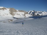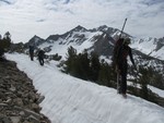A 6h, nous sommes partis vers le menaçant Mather Pass ; ca rigolait pas trop ; on avait tous un peu peur. Le début de la montée que l'on avait déjà fait la veille n'a pas posé de problème puis nous sommes montés tout droit au milieu de la coulée de neige de l'avalanche ; Steph et Jacob y taillaient des marches à tour de rôle et nous les filles, nous les suivions de près : pied droit, pied gauche, piolet ... c'était vraiment raide. Puis nous avons continué vers la droite quasiment jusqu'au pass, nous avons fini en grimpant à travers des rochers, le col en lui-même n'était qu'une grande corniche de neige que nous préférions éviter ; la neige devenait vraiment mauvaise : avec la chaleur du soleil, elle n'avait plus aucune consistance et ça devenait difficile et aléatoire de s'y appuyer ou d'y planter le piolet. Nous avons choisi de finir la montée en traversant des rochers et enfin nous sommes arrivés en haut; ouf, l'autre versant n'avait pas l'air bien méchant et comme il était encore a l'ombre la neige était encore dure.