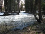 Heureusement pour passer Woods Creek, il y a un pont : le débit est impressionnant. Ensuite nous commençons la montée de 12km qui mène à Pinchot pass. Le début n'est pas enneigé et c'est tres agréable ; nous avons l'impression de faire de la rando, enfin ! Puis ça se complique : il n'y a pas de neige mais il y a beaucoup beaucoup d'eau et donc de gros cours d'eau à franchir. Heureusement Jack est assez fort pour touver le meilleur endroit pour passer mais ca prend du temps et ce n'est pas toujours très rassurant surtout quand nous passons sur un pont de neige. Puis la neige est de retour, y'en a marre de toute cette neige ...