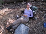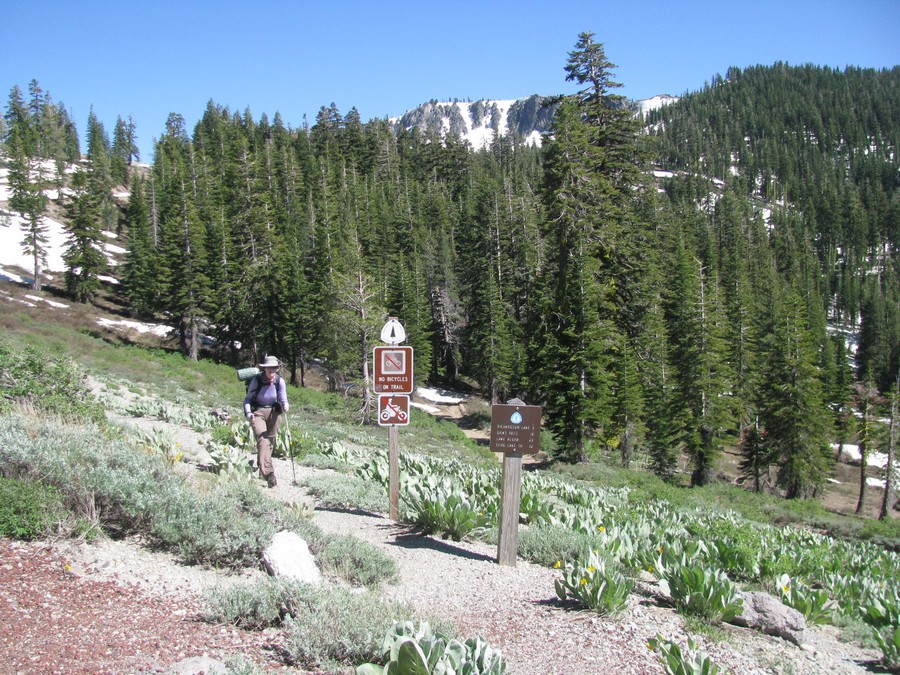 Je suis un homme neuf ! Ou plutôt un thru hiker neuf ... Car un thru hiker n'est pas un Homme après 2 mois et demi mais une bête féroce qui marche qui marche et qui marche (sur un chemin ou pas d'ailleurs). Nouveau pantalon (avec l'ancien j'avais des courants d'air aux fesses), nouveau tee-shirt et nouveaux bâtons (n'achetez pas des komperdell pour marcher aux US car les pièces de rechange ne courent pas les rues ici, j'ai dû m'en acheter une nouvelle paire, du coup, je transporte les anciens dans le sac car ils sont réparables, je les renverrai à la prochaine ville). Voilà de 8 à 10 ce matin notre occupation à South Lake Tahoe ... Le tout en taxi car la ville s'étend sur 6 miles ... Ce même taxi nous ramène à Echo Lake pour repartir sur le trail. Nous commençons à marcher vers 10h45 ! Nous longeons lower et upper Echo lake. Il y a une multitude de "cabins", résidences d'été en bois très jolies. Nous rencontrons beaucoup de day hikers le long des lacs (vacances d'été ici aussi) mais plus personne plus haut sur le chemin quand la neige apparaît. Nous, nous continuons vers Desolation Wilderness puis vers Dick Pass, la difficulté du jour. 3 miles de montée et une vue superbe. La descente est rapide dans la neige. Nous arrivons au mile 1111 où nous campons. Vue sur le Lake Tahoe et dîner sur les rochers encore chauds du soleil de la journée. Elodie fait 3 hang up ! car nous n'avons plus les bear canisters (non obligatoires maintenant). 1 kg en moins dans le sac. Ce soir, nous tentons un nouveau dîner, semoule - tomates et épinards secs, le tout dans de l'eau chaude hum !