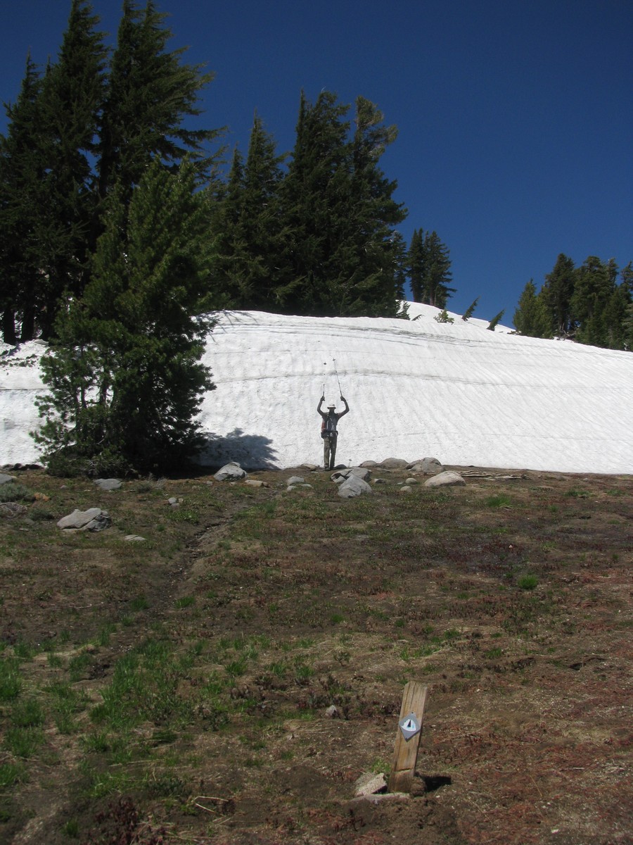 J'oubliais : Mango et Eddy sont partis avant nous mais au premier névé (soit 100 m après le départ), nous les rattrapons. Mango est vraiment trop lent pour qu'on l'attende. Eddy, lui, nous suivra toute la journée. Au détour d'une conversation, je comprends mieux ses difficultés d'orientation. Son GPS n'a pas de carte intégrée ni la trace du PCT ... bref, il ne sert à rien. Parfois, je le vois même sortir sa boussole ... Mais sans carte papier ... Y'a vraiment des branquignoles sur ce trail. En fait, il est arrivé jusque là (et sans skiper), en suivant des gens. Pour moi, ce n'est pas mettre tous les atouts de son côté pour réussir ! Je trouve que beaucoup trop d'hikers prennent ce trail à la légère ... Et c'est dangereux pour eux je pense. Il faut être complètement autonome sur ce terrain, d'autant plus si on le commence seul ! Et si l'on se rend compte que l'on ne l'est pas, on fait le nécessaire pour le devenir (comme nous qui avons appris à se servir d'une corde pour les "river crossings" aux cotés de Jacob). Bref, à la prochaine ville, j'apprendrai à Eddy à intégrer la trace du PCT dans son GPS ... un peu tard pour lui mais au moins, nous ne l'aurons pas derrière jusqu'au Canada.
