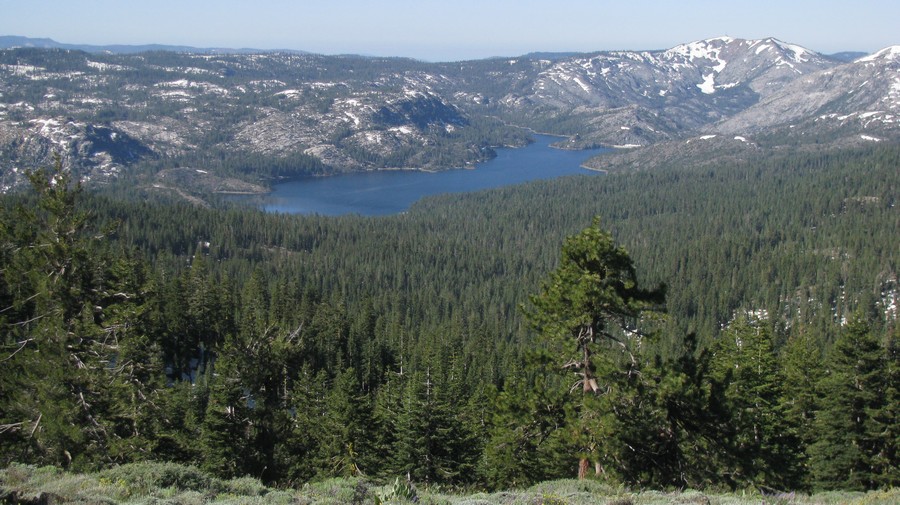 Ce matin, je n'ai même pas entendu le réveil ... C'est le soleil qui donne sur la tente qui me réveille ; qu'il fait bon ! Nous commençons à 6h50 par la montée qui mène au Tahoe Rim Trail. Un rim est une crête, et celle-ci donne sur le lac Tahoe. La montée est délicate dans la neige étonnamment dure pour les températures actuelles. Nous utilisons nos microspikes. Sur le rim, c'est magnifique. Quelle vue ! Peu de neige, que des névés. Par contre, l'un d'entre eux nous fait sortir micro spikes et piolet. Il est fortement en devers sur une face nord. Nous y allons doucement en taillant de belles marches. Ca passe. Nous nous arrêtons souvent pour mettre et retirer les microspikes ... Mais c'est bon signe : la neige n'est présente que par plaques maintenant.. Nous cheminons souvent dans les fleurs multicolores avec vue sur le lac. Lors de la descente, nous passons sous un des télésièges de Squaw Valley Ski Resort. Nous faisons d'ailleurs du ski sur nos pieds en coupant les switch backs. La neige en descente ... On aime ! La journée se finit par une ascension assez raide mais splendide et sans neige vers Anderson peak et sa crête. Nous campons vers 18h30 et 20 miles sur le rim.
