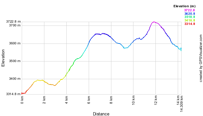 Au réveil, il pleut ; du coup, nous ne nous pressons pas pour partir et attendons 9h30 pour commencer à marcher. Le trail monte tranquillement jusqu'à Jarosa Mesa que nous traversons. Le temps est instable, entre deux gros nuages noirs et quelques gouttes de pluie, nous apercevons un morceau de ciel bleu. Nous pouvons voir derrière nous le plateau de Snow Mesa, à notre droite de hautes montagnes dont certaines de couleur rouge, à notre gauche, ce sont des prés vallonnés bien verts et tout droit ... ça monte.